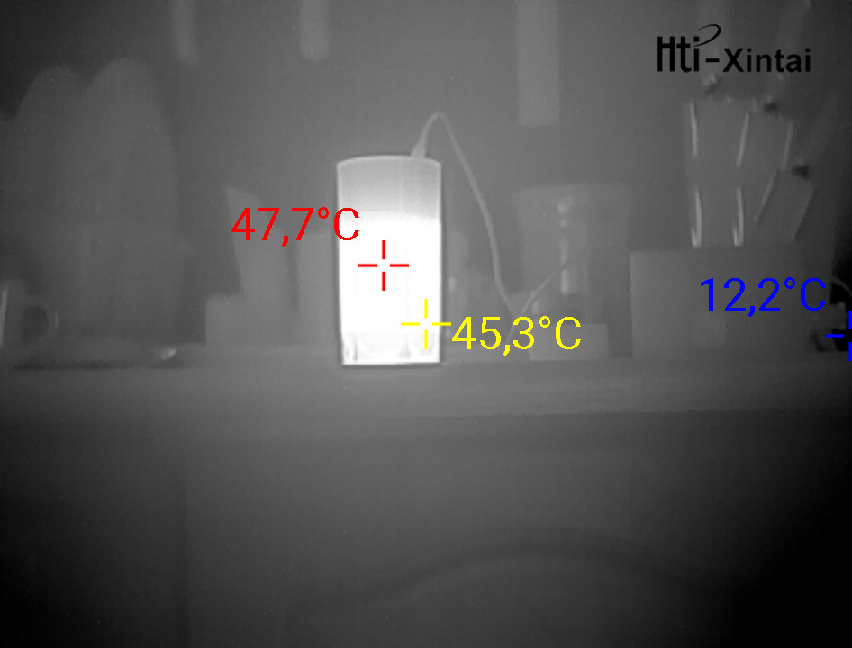 Enclosure of camera seems like plastic, but it is aluminium. The camera has a big 13mm lens. Many other thermal cameras have only 6-9mm lenses, but the bigger lens is the more infrared radiation pass through and the better quality of image. If you rotate lens, you can adjust focus. Minimum focus distance is about 15cm.